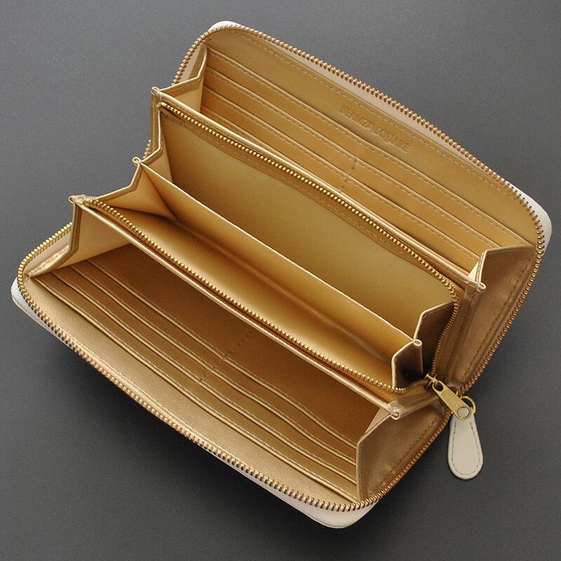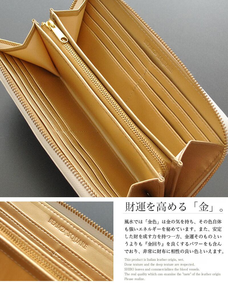 BEAMZSQUARE マットホワイト×ゴールド 牛革ラウンドファスナー 長財布 開運 金運 財布