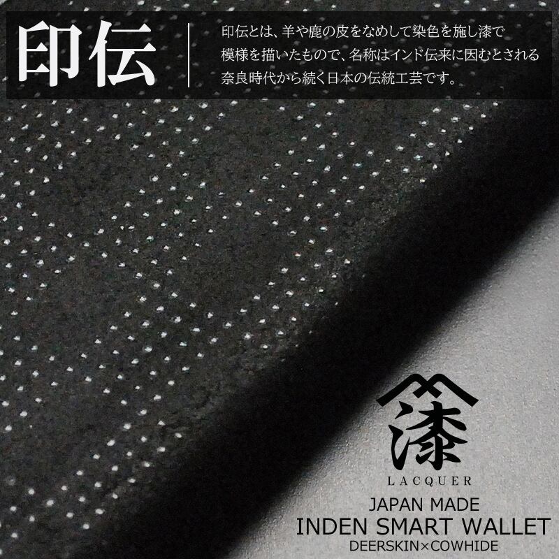ブラックに黒色漆の艶が光る日本製印伝スマート長財布。