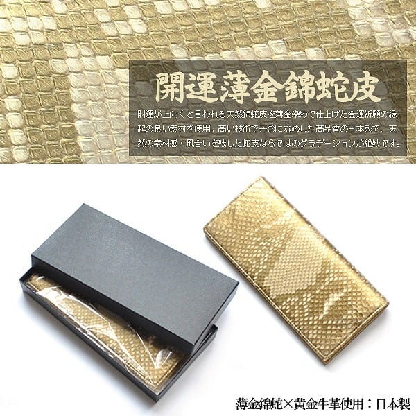 財運が上向くと言われる錦蛇革を薄金染めで仕上げた金運祈願の長財布。