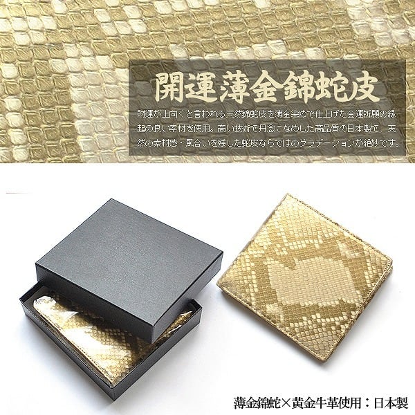 財運が上向くと言われる錦蛇革を薄金染めで仕上げた金運祈願の折財布。