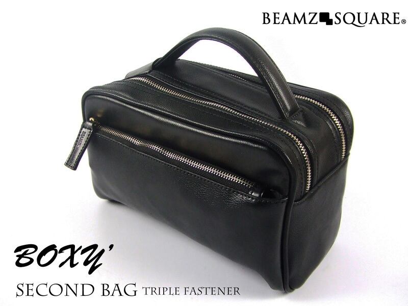 BOXタイプの大容量セカンドバッグが登場!外部3か所に設けられたファスナー収納で、まるでミニボストンのような圧巻の収納力を実現!バイブルサイズの手帳や、財布などの小物も