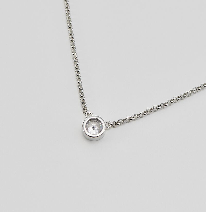 エレガントなデザインの覆輪留めキュービックジルコニア磁気ネックレス。1.4カラットのキュービックジルコニアが、繊細なベルサーチェーンに美しくセットされています。石の周囲を筒状で留める台座が光を取り込み輝きを放ちます。さらに、150ミリテスラの磁力が肩こりや首の緊張を緩和し、リラックス効果も期待できます。